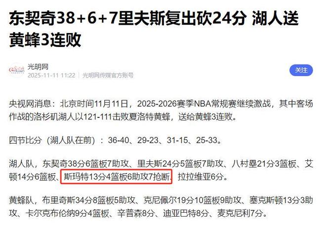 本赛季湖人的防守提升有目共睹,而斯玛特正是后场的“防守核心”,他不仅能自己完成抢断和补防,还能指挥队友跑位,让湖人的防守体系更具整体性。